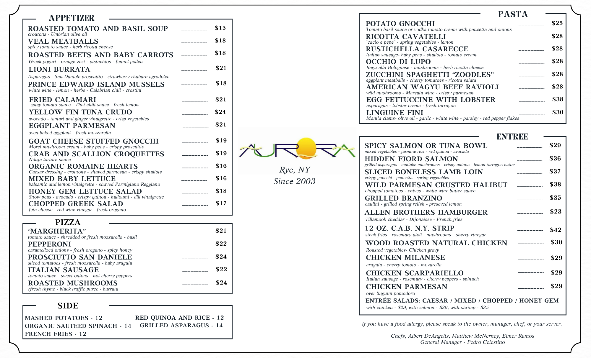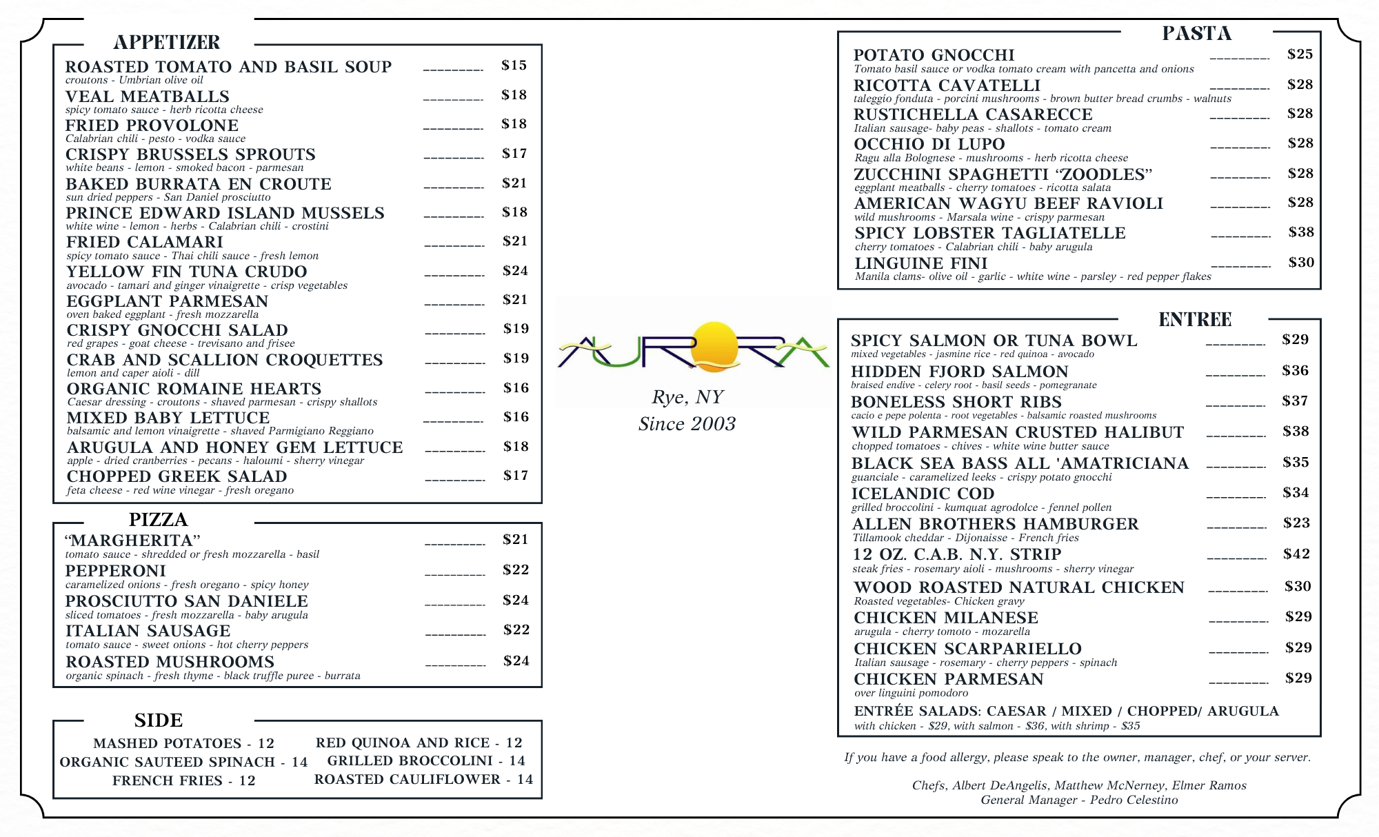 At Aurora, our culinary team strives to offer a menu selection that everyone can find something to love on. From sharable, inventive appetizers and deliciously prepared entrées to our brick oven-fired pizzas and creative handmade pasta dishes — take a look at our menu to get an idea of what your dining experience at Aurora will be like.