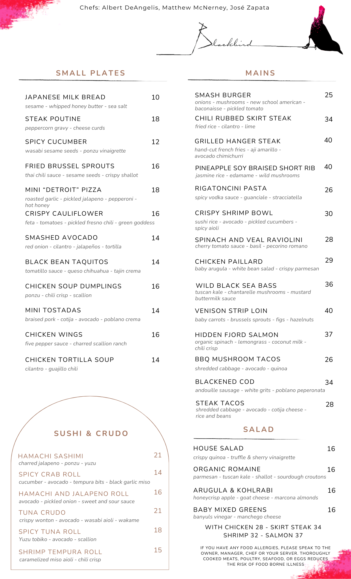 Embark on a journey of global flavors at Blackbird. Drawing inspiration from cooking styles and tastes worldwide, Blackbird is a melting pot of culinary excellence right in the heart of downtown New Canaan—small plates designed for sharing amongst friends, complemented by fine wines and dazzling craft cocktails. Check out the menus below to see what our current seasonal offerings are.
