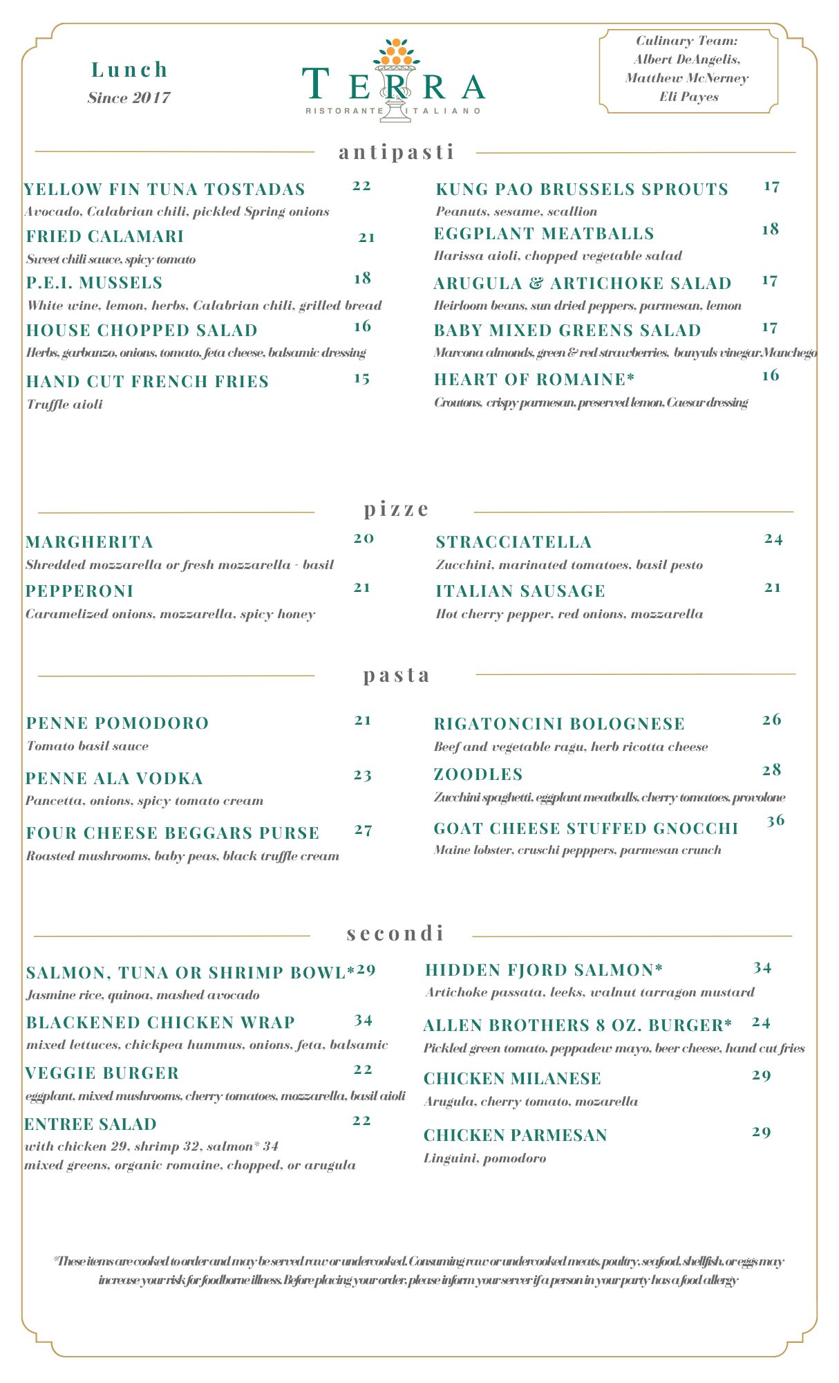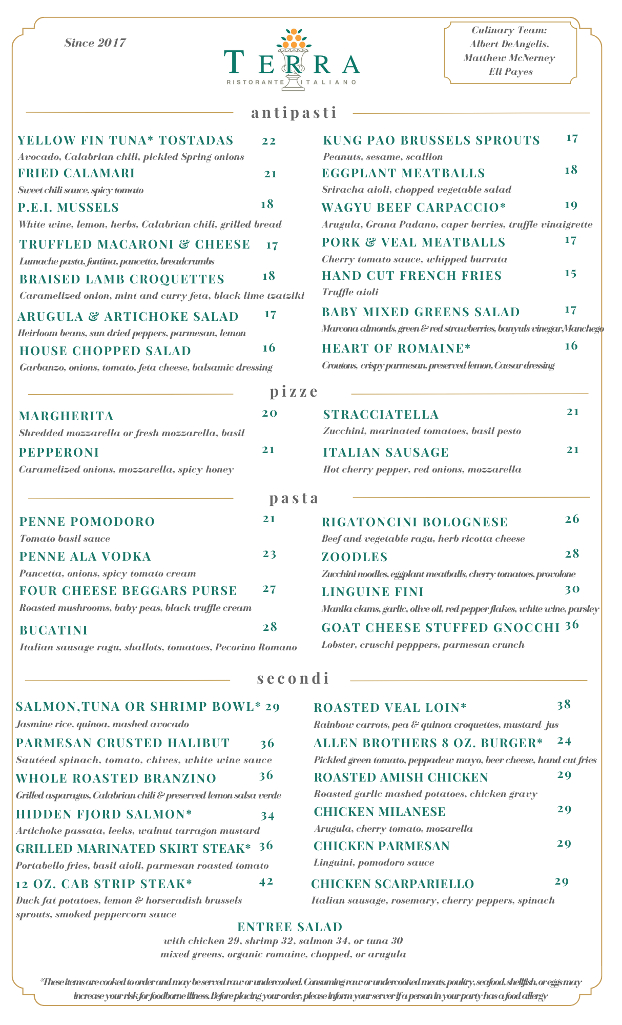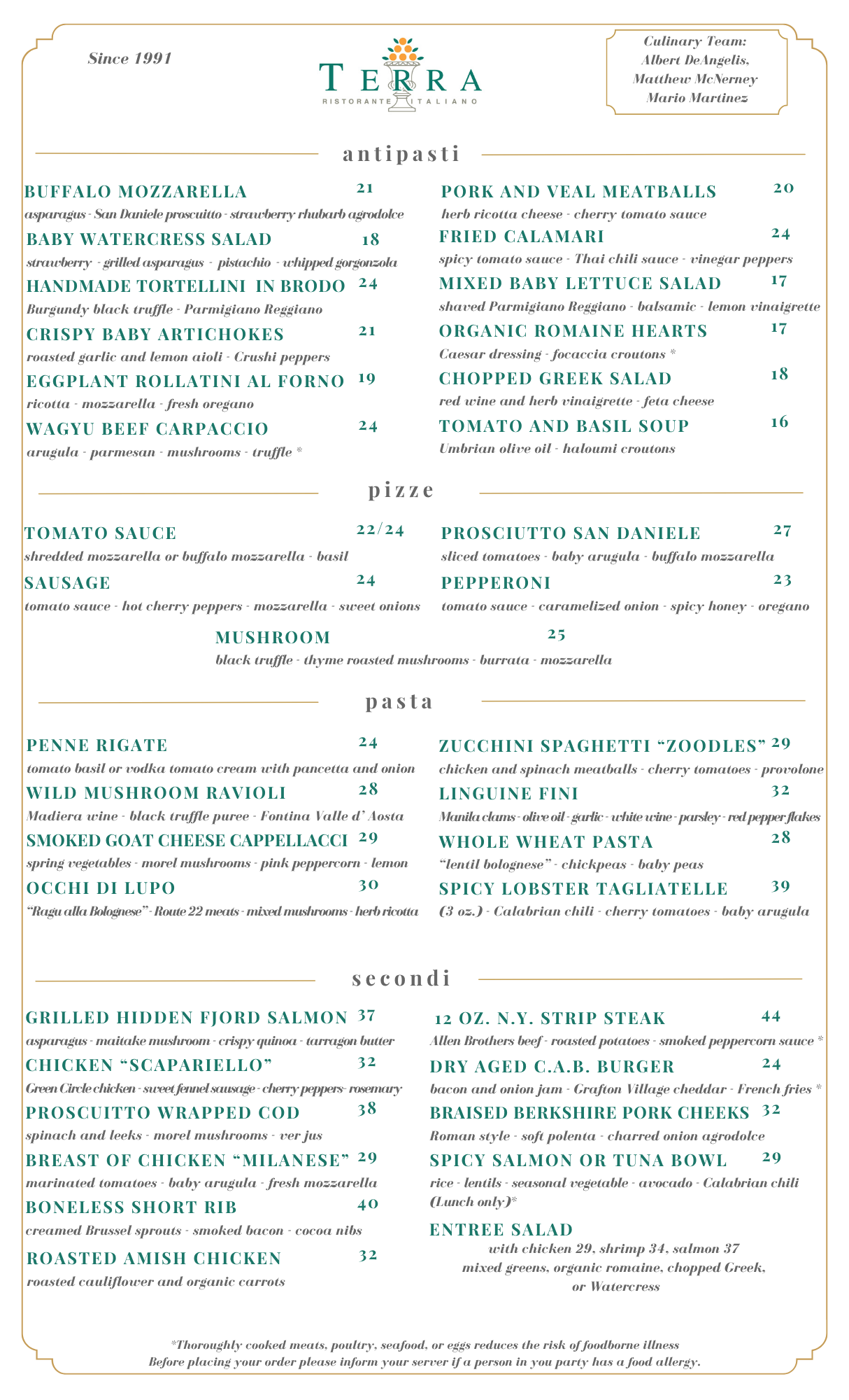 Where traditional Northern Italian cooking meets modern culinary expertise. Terra Danbury has a menu of creative dishes that are seasonally inspired and made with only the freshest ingredients. Homemade pasta, pizza, and an array of appetizers and entrées ensure that anyone can find something to love here. Explore our full culinary offering by checking out the menu below.